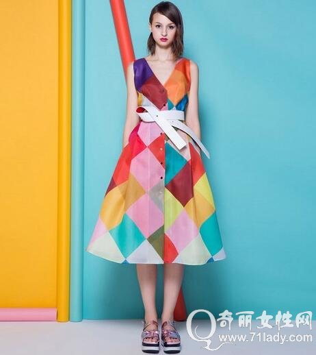 夏天的色彩也让我们惦记,虽然不管什么时候五彩缤纷都不是难事,但总觉得夏天才是色彩最光明正大的方向。五彩撞色,赤橙黄绿青蓝紫,方方正正的格子,高腰伞裙的张扬和夏天的张扬如出一辙。