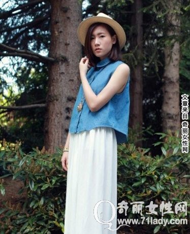 宽松的牛仔马甲搭配白色长裙,清新中带点优雅的味道,简单有魅力呢,选择平底鞋和草帽来搭配,格外小清新。