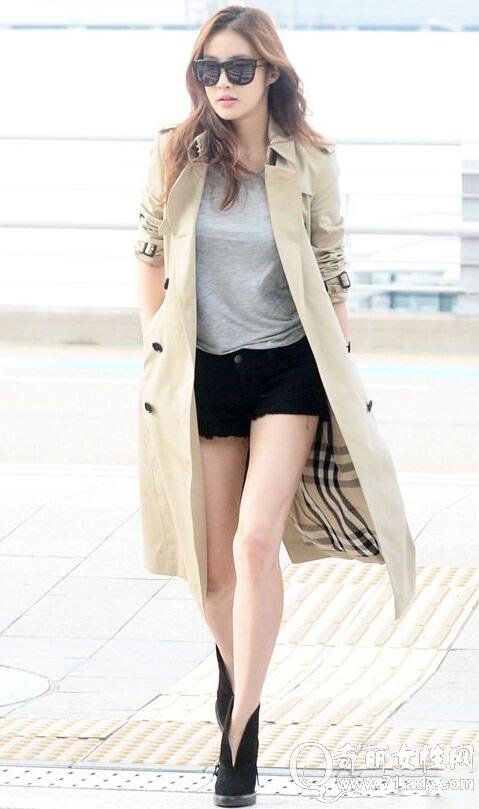 除了长裤之外,中长款风衣搭配t恤、短裤和短靴也相当出彩,大秀白净美腿,分外养眼吸睛。