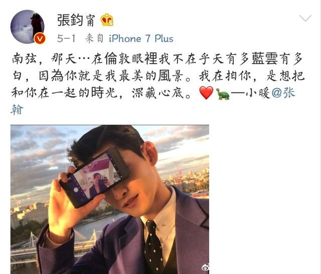 几乎是在同时,作为事件的女主,张钧蜜同样也发布了一篇微博,在微博中她称:“南弦,那天,在伦敦眼里我不在乎天有多蓝有多白,因为你就是我最美的风景。我在拍你,是想把和你在一起的时光,藏在心底。-小暖@张翰”。