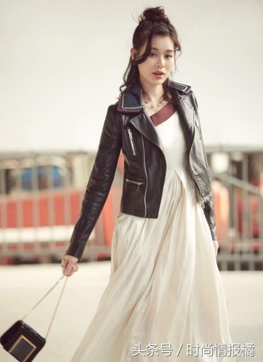 胡杏儿不仅演技好,很敬业,时尚感也很好,她身穿白色连衣裙,外加黑色皮衣外套,简约大方,时尚感爆棚,小丸子头很减龄。