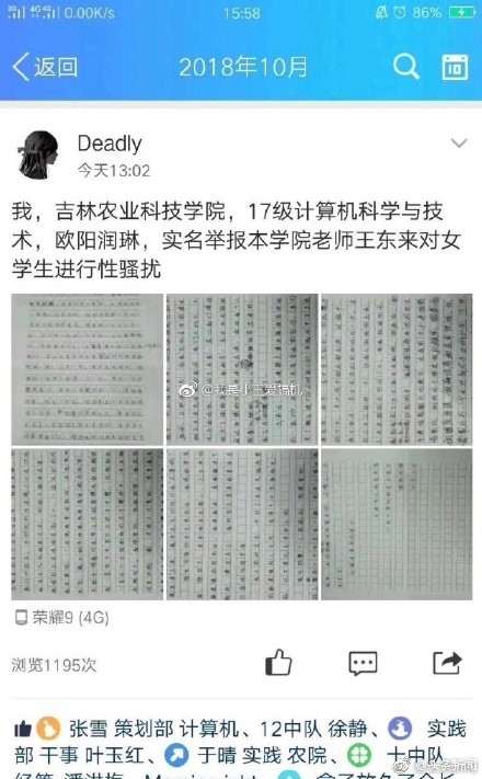 有网友爆料吉林农业科技学院一教师性骚扰自己,该教师还涉嫌论文抄袭。据爆料:该名教师2010年12月发表在《制造业自动化》上的论文《入侵诱骗系统应用技术研究》与南京航空航天大学郁纬2007年的硕士论文《入侵诱骗系统中数据捕获的研究与实现》相似率高达92%。10月19日下午,当事女生QQ空间已删除举报内容,目前学校领导在找她谈话,事件还在进一步核实中。