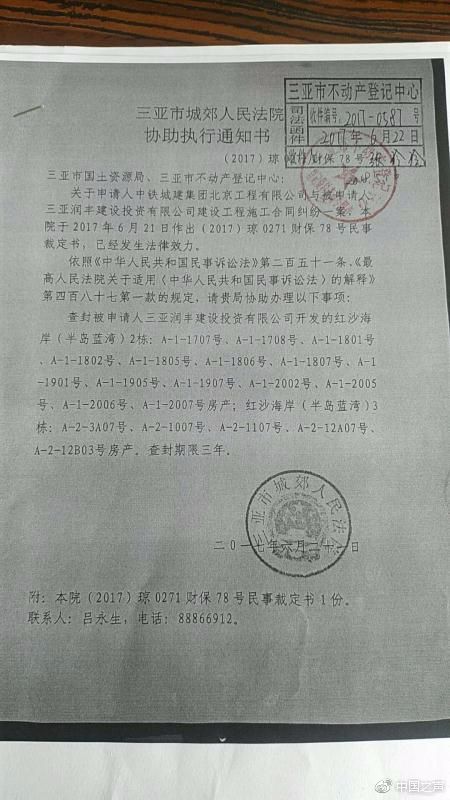 她表示,她的房子第一个查封就是三亚城郊法院2017年的5月2号,她买房子是2017年的10月27号,所以开发商明知这个房屋已经查封,还有一个2018年的4月8号是海南省高院的一个协助执行通知书。2018年的3月19号,北京市第三中级人民法院也是查封协助执行书。2018年的3月6号,上海第一中级人民法院。