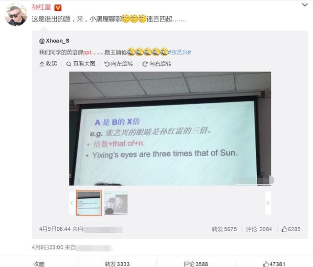 还记得上回孙红雷被批“买”热搜吗?这次孙红雷又上热搜了。但是却不是买的。昨天孙红雷被嘲笑眼睛小,竟然登上了英语课件,本来是介绍“A是B的X倍。”但是举的例子却亮了:张艺兴的眼睛是孙红雷的三倍,然后配图就是张艺兴和孙红雷两人的照片,感觉太有喜感了!但是对此孙红雷表示不服。