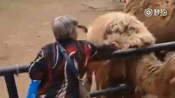 老太太逛动物园薅骆驼毛