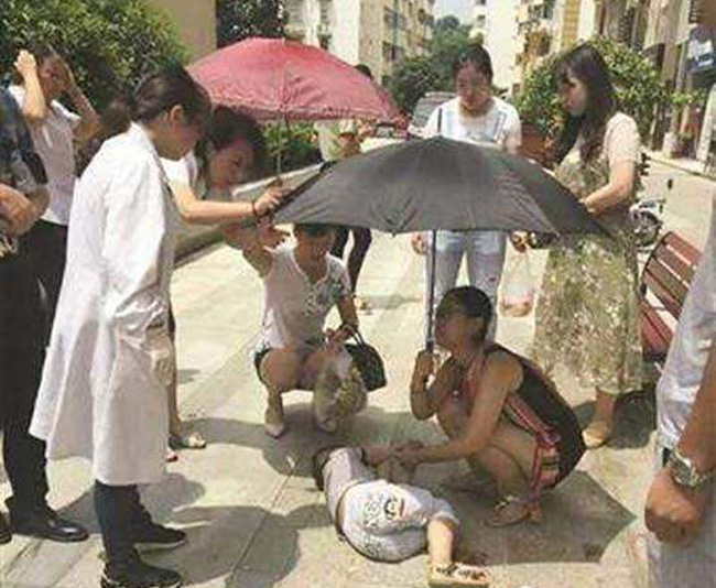 店员马上大呼喊来了周边店铺的工作人员和群众,看到这一幕的人们立即就有人报了警叫了救护车。当时正值当午,太阳非常的猛烈,有的群众感觉到之后就拿了几把伞在旁边撑着小男孩。