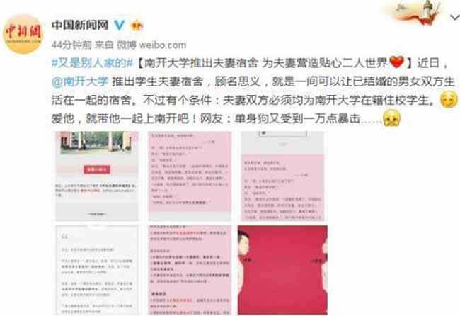 据了解,该学校是南开大学,为了方便学校学生夫妻的日常学习生活,学校经过深思熟虑才推出这样集空调、WIFI、独卫、双人床、阳台、厨房等各类设施于一体的夫妻宿舍,只要夫妻双方都向学校提出申请,并提供相关的证明材料就可以入住,而且早在上世纪九十年代学校就施行了这项举措,只是最近才在网上引起关注。