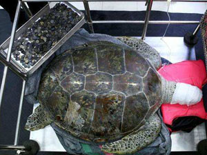 泰国海龟误吞许愿硬币 目前已做手术成功取出915枚硬币
