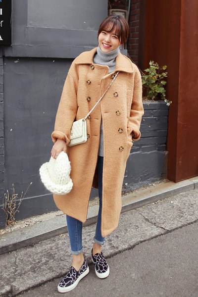 爆裂图案的懒人休闲鞋,个性时髦,搭配浅驼色大衣,灰色毛衣和经典牛仔裤,优雅风、休闲风的完美结合。
