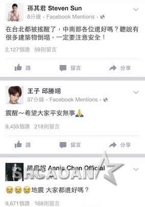 脸书上流传着各地即时现场照,演艺圈的艺人们也被摇醒,如王传一、王子、曾沛慈、mp凯开、孙协志等人,po文问粉丝平安及状况。天团五月天的主唱阿信4点在脸书po文“大地震”,瞬间吸引了十多万粉丝按赞并且纷纷留言。阿信也进一步回复:“我以为我熬夜头晕了, 希望一切平安。”甚至连不在台湾的鬼鬼也发文询问,显然这次地震的强大,让大家都惊吓到了。