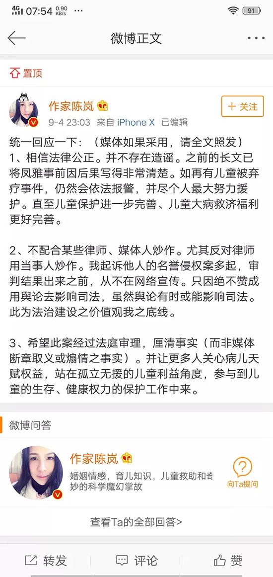 陈岚回应:相信法律公正,并不存在造谣