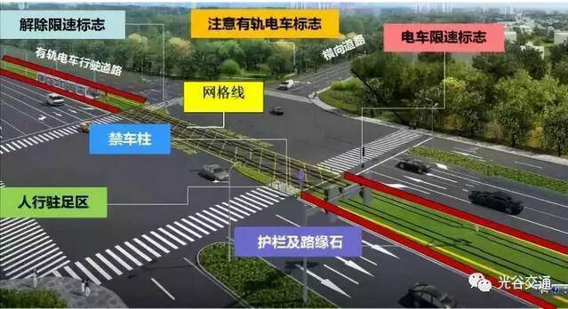 光谷有轨电车通过智能交通信号、电子警察、视频监控系统,已接入市区交管指挥平台一张网,有轨电车信号灯与社会车辆信号灯统一联动,有轨电车严格按照路口交通信号行驶通行;同时,在沿线路口设有交通标识标线、标志标牌、反光设施,提醒社会车辆驾驶员和行人遵守交通规则。