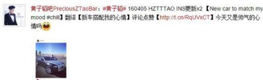 近日,有网友po出黄子韬在社交网站上炫豪车的照片,照片上,黄子韬站在豪车旁潇洒摆酷,配文称“new car to match my mood”。前不久才晒出豪宅的黄子韬又来晒豪车了,霸道总裁范儿十足。